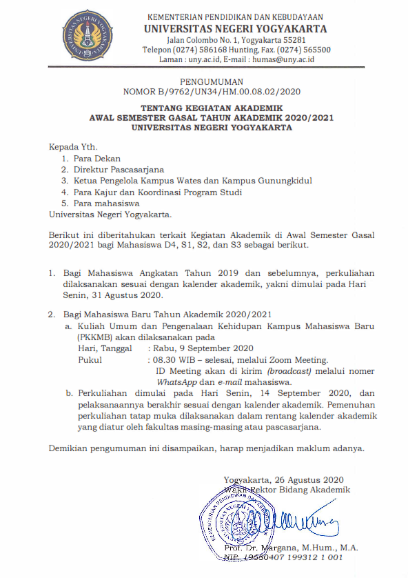 Awal Perkuliahan Semester Gasal TA 2020/2021 Universitas Negeri Yogyakarta