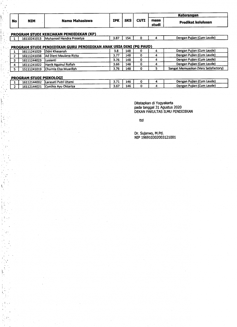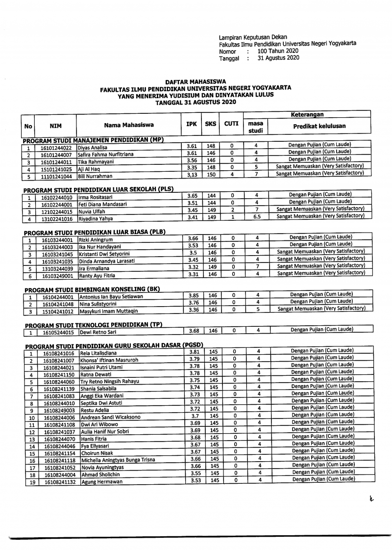 Pelaksaan Yudisium Periode Agustus 2020 FIP UNY