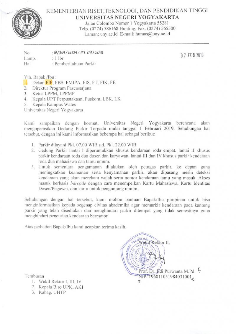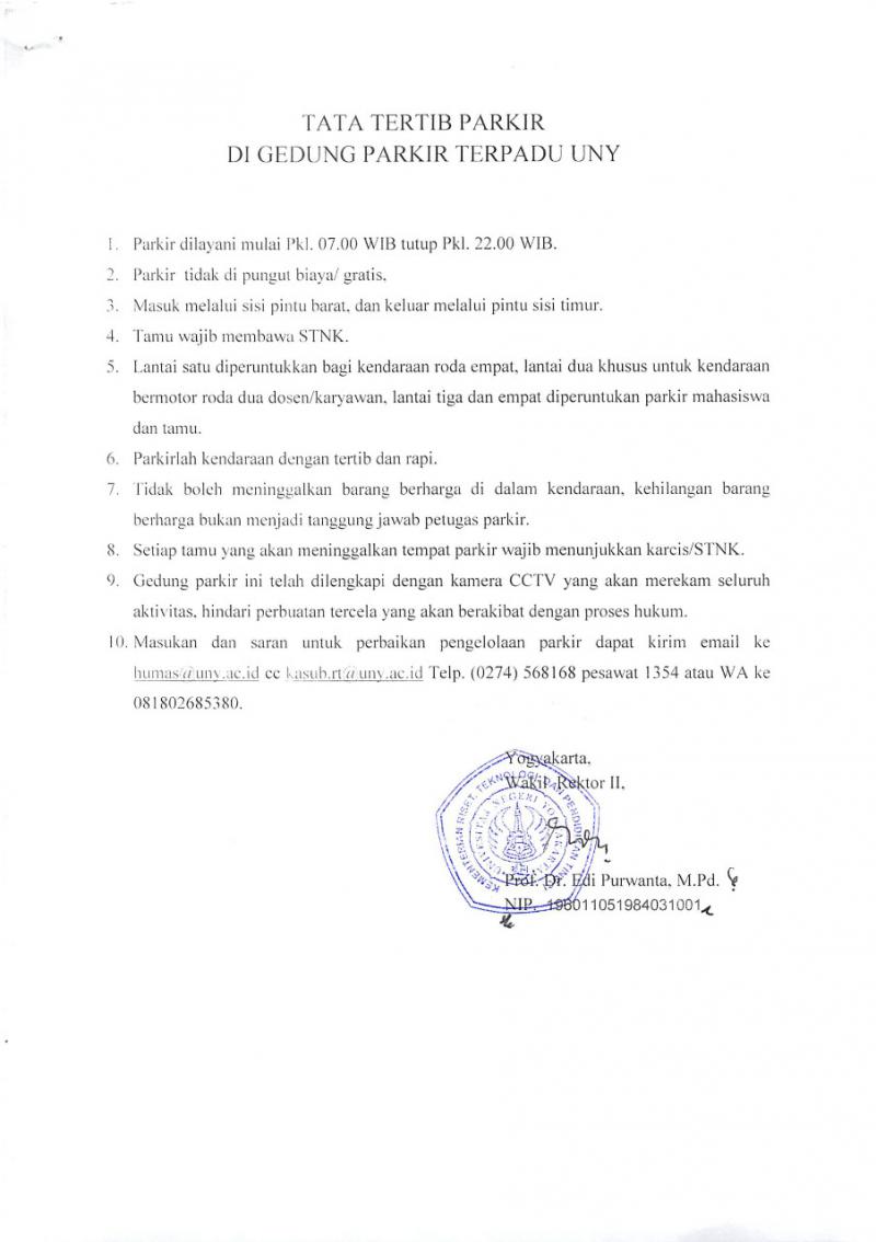 Pengumuman Ketentuan dan Tata Tertip Gedung Parkir Terpadu UNY